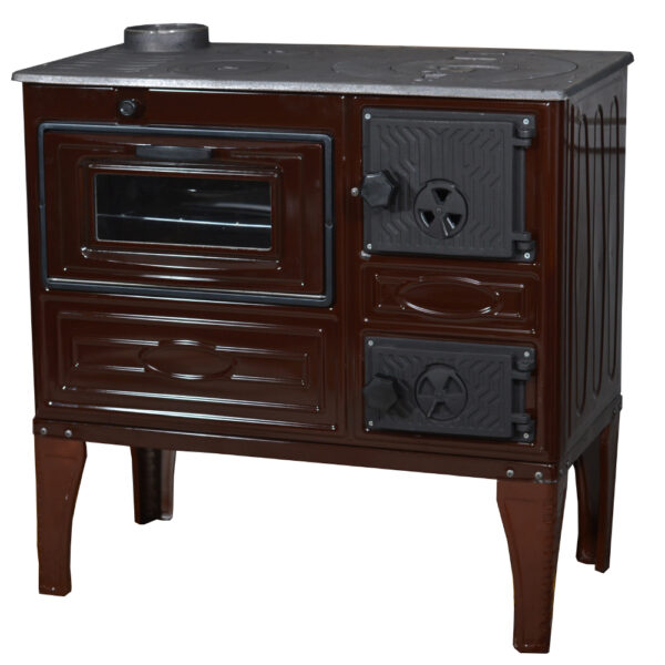 Az öntöttvas tűztér hosszú élettartamot és kiváló hőtartást biztosít. A masszív öntöttvas főzőlap ideális ételek készítéséhez vagy melegen tartásához. A zománcozott acél sütő (400x400x195 mm) tökéletes kenyér, sütemények és egyéb házi ételek sütésére.